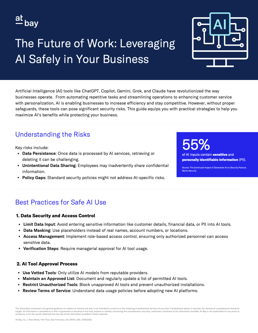 Artificial Intelligence (AI) tools like ChatGPT, Copilot, Gemini, Grok, and Claude have revolutionized the way businesses operate. From automating repetitive tasks and streamlining operations to enhancing customer service with personalization, AI is enabling businesses to increase efficiency and stay competitive. However, without proper safeguards, these tools can pose significant security risks. This guide equips you with practical strategies to help you maximize AI’s benefits while protecting your business.